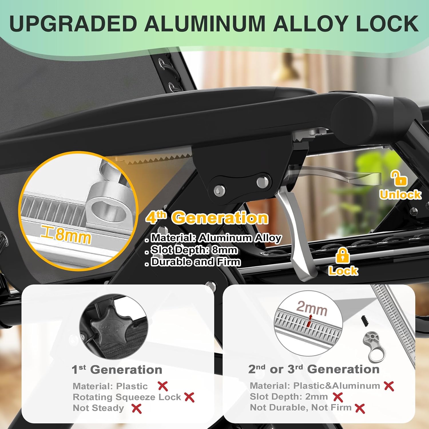 【Easier to Adjust and Lock Chair】Zero gravity recliner with the third-generation upgraded aluminum alloy lock makes it easier to adjust the chair from 90º to 170º. The 8mm deep groove locks the recliner more firmly, and is more durable than the previous 2-generation 2mm plastic and aluminum buckles, making the recliner safer to use and will not fall from it. Smoothly adjustment, easy to get a stress-free weightlessness, to achieve the best state of relaxation