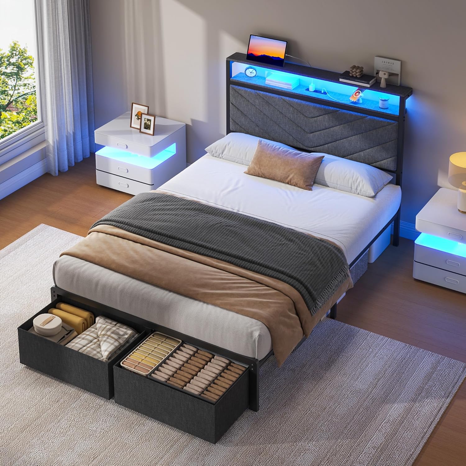 This Queen Bed Frame is a great spaceâsaving and modern addition to my bedroom. The two underâbed drawers offer plenty of storage and slide out smoothly. The LED lights are a fun touch with tons of color options and an easy remote. I love the builtâin charging station on the headboardâsuper convenient for phones and other devices. The upholstered headboard is comfortable to lean on, and the metal frame feels sturdy and stable. Easy to assemble and definitely worth it!