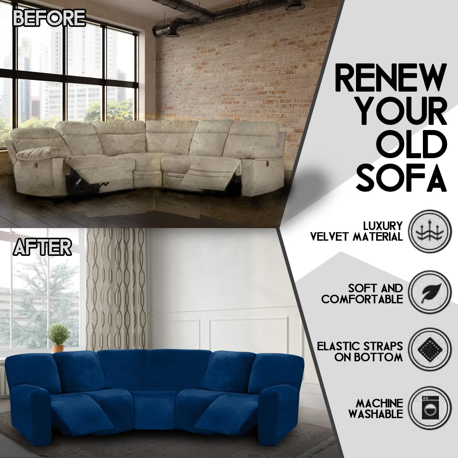 HIGH QUALITY MATERIAL: WE HAVE A PATENT ON THIS ITEM,This innovated PATENTED 7 piece L Shape reclining sofa cover is crafted from luxurious velvet plush fabric, and is very soft, comfortable and sturdy ULTIMATE DECORS sofa covers are as close to custom, made for a 5 seat L shape recliner sofa with the option to add additional seats and Console covers.