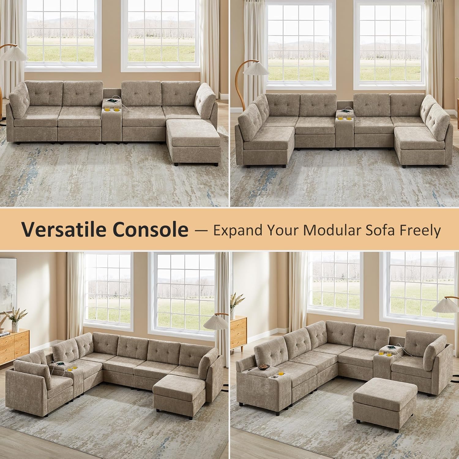 The VANOMi Modular Sectional Sofa redefines comfort and flexibility in home seating. Designed as a six-seat living room couch, this modular sectional offers a generous footprint of 118.1″ wide by 86.2″ deep and 33.5″ high—perfect for families, guests, or anyone who enjoys lounging in style. Upholstered in soft, durable chenille fabric in a warm camel tone, the sofa blends elegance with everyday practicality. Its modular construction allows you to create custom configurations that adapt to your space, whether you’re furnishing a spacious living room, a compact apartment, or even a bedroom corner. Complete with matching throw pillows, this sofa is built for both relaxation and lasting use.