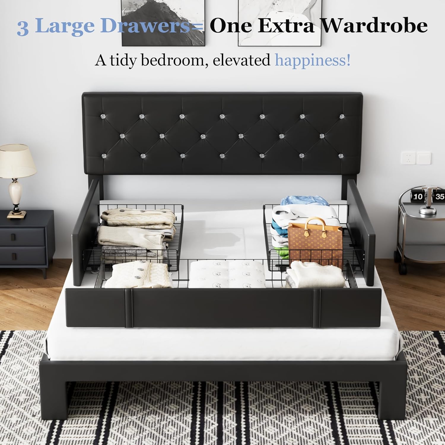 The VECELO Queen Size Bed Frame with Storage Drawers is thoughtfully designed to combine elegant upholstery with practical bedroom functionality. This modern platform bed features a luxurious diamond-tufted headboard made from high-quality PU leather, offering a sophisticated aesthetic that enhances any contemporary or transitional bedroom decor. Built for durability and comfort, the bed integrates two spacious under-bed storage drawers—perfect for keeping linens, clothing, or seasonal items neatly organized without cluttering your living space. With its solid wood slat support system and reinforced metal frame, this bed provides reliable mattress support while eliminating the need for a box spring, making it an ideal choice for streamlined setups and space-conscious homes.