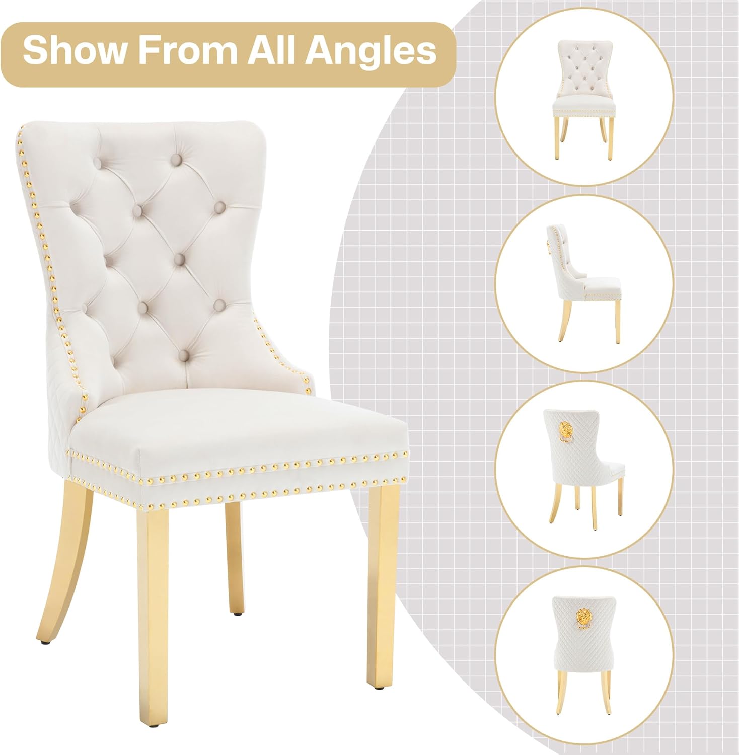 The Velvet Dining Chairs Set of 4 from the Nikki Collection redefines luxury seating with a perfect blend of comfort, craftsmanship, and timeless elegance. Designed for those who appreciate refined aesthetics, each chair is meticulously crafted to elevate your dining space—whether it’s a formal dining room, a stylish breakfast nook, or a chic lounge area. Featuring premium velvet upholstery, polished gold stainless steel legs, and distinctive design details like a lion head pull ring and button tufted back, this set offers both visual sophistication and long-lasting durability. The neutral beige tone ensures effortless integration into a wide range of interior styles, making it a versatile and enduring addition to any home.