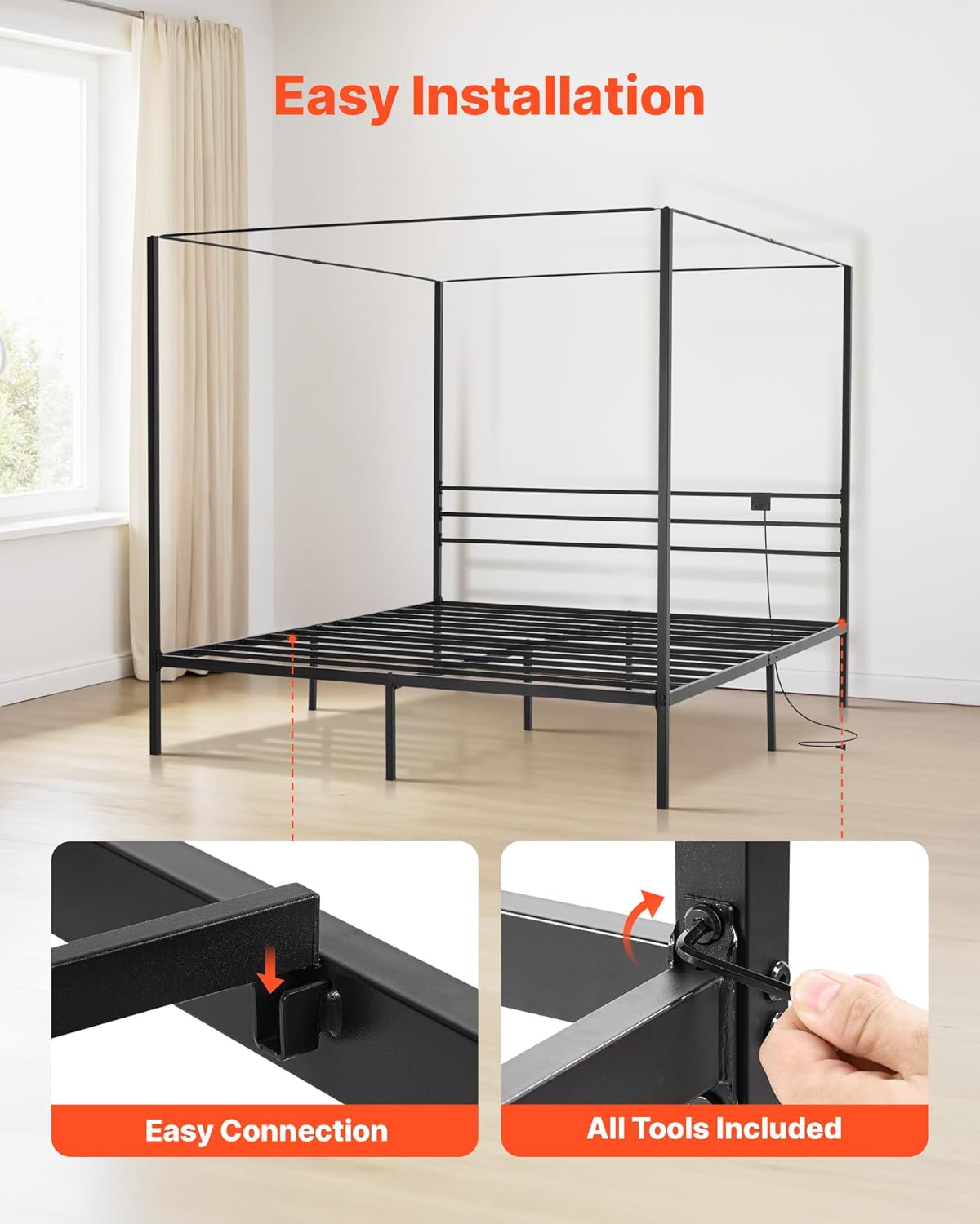 The VEVOR Canopy Bed Frame King Size combines sleek design with practical functionality, offering a stylish and modern solution for bedroom organization and comfort. This heavy-duty steel frame provides ample underbed storage space—12.4 inches high—making it ideal for maximizing space in smaller bedrooms or homes with limited closet storage. Designed with a four-poster aesthetic, it enhances the visual appeal of any room while supporting mattress-only setups without requiring a box spring. The inclusion of a clip-on charging hub adds everyday convenience, allowing users to keep devices powered up right beside their bed. Easy assembly, durable construction, and thoughtful features make this canopy bed a reliable choice for contemporary living.