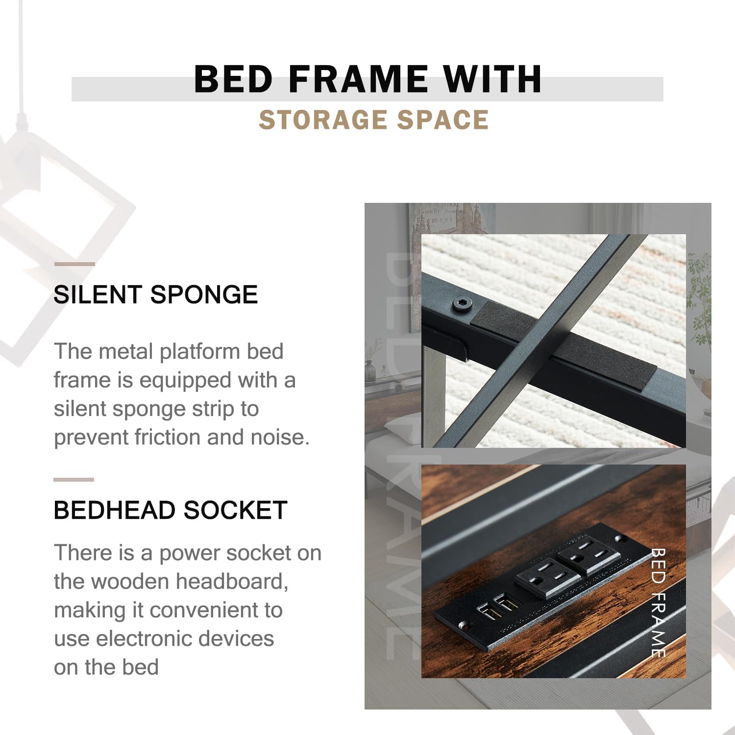 • Built-In Power Outlets: Integrated into the headboard are practical electrical outlets, allowing you to charge smartphones, tablets, e-readers, or bedside lamps without reaching across the floor. This thoughtful addition supports late-night reading or early-morning routines with seamless connectivity.