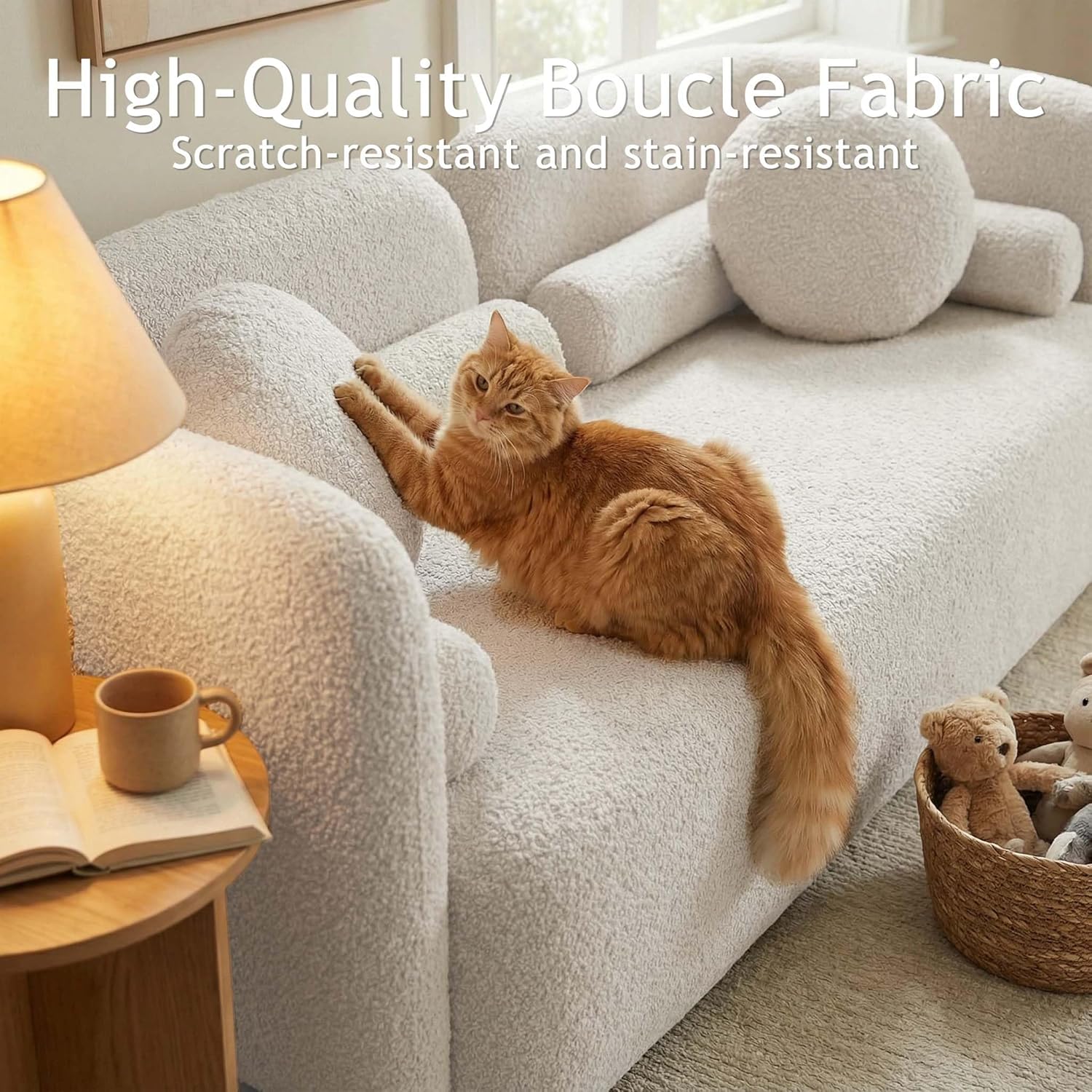 If you value quiet sophistication, thoughtful design, and practical elegance, this Japandi-inspired sofa delivers all three. Unlike trend-driven pieces that lose relevance quickly, its minimalist curves and neutral palette remain stylish season after season. The combination of premium materials—boucle fabric and solid wood—ensures it looks as good as it feels, day one and years later. And because it arrives with matching pillows and cushions, there’s no guesswork or extra shopping needed.